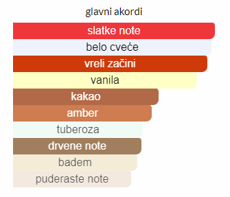 - Bazne note: Tonka, Kakao, Vanila, Praline, Sandalovo drvo, Mošus, Amber, Kašmir, Cimet, Pačuli, Kedar