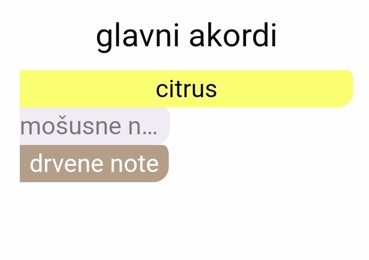 - Gornje note: Crvena narandža, Limun, Grejpfrut, Lajm, Mandarina i Sicilijanski bergamot
